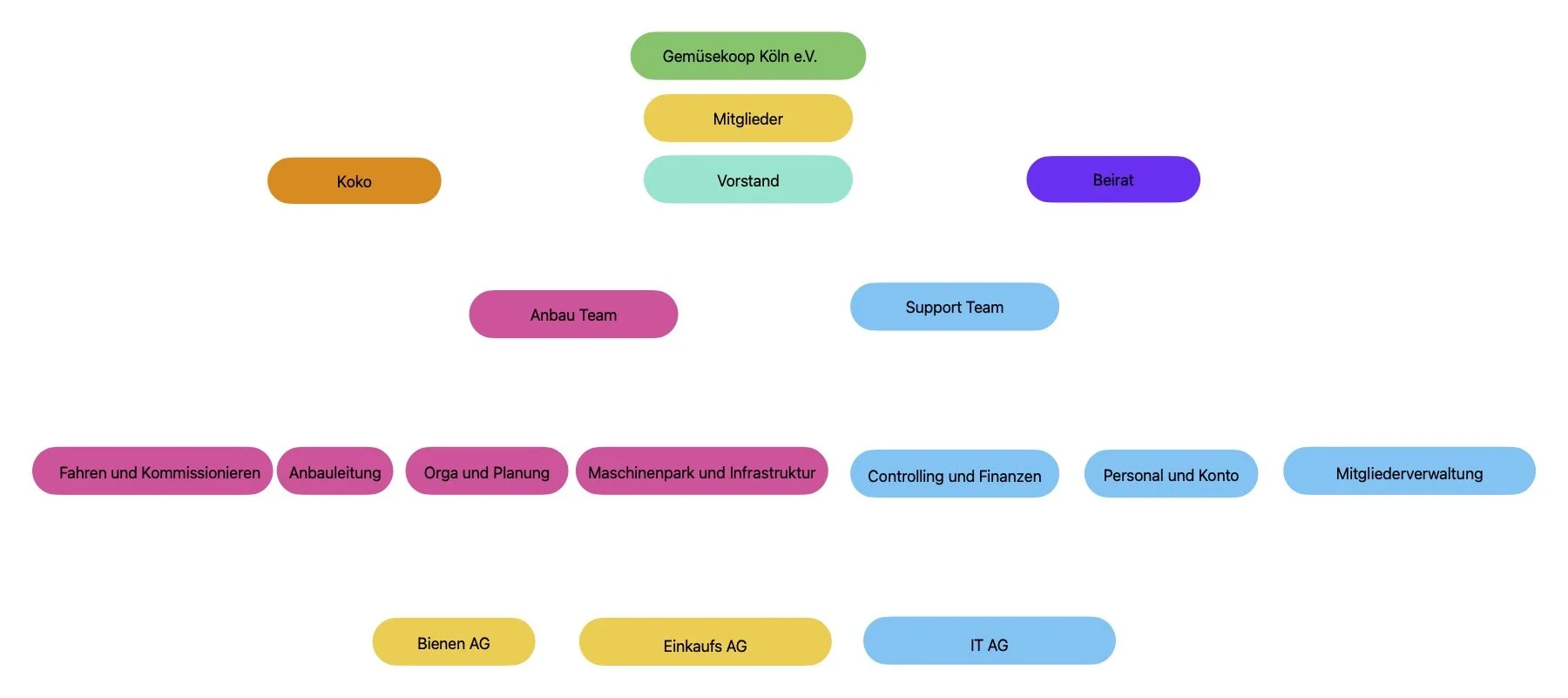 Wir sind als Verein organisiert. Unsere Orga Struktur ist allerdings an einer Genossenschaft orientiert. Das oberste Gremium ist die Mitgliederversammlung. Sie entscheidet über Satzungsänderungen und Grundsatzentscheidungen. Im laufenden Geschäft entscheidet der Vorstand im Rahmen der Satzung. Der Vorstand wird von einem Beirat unterstützt.